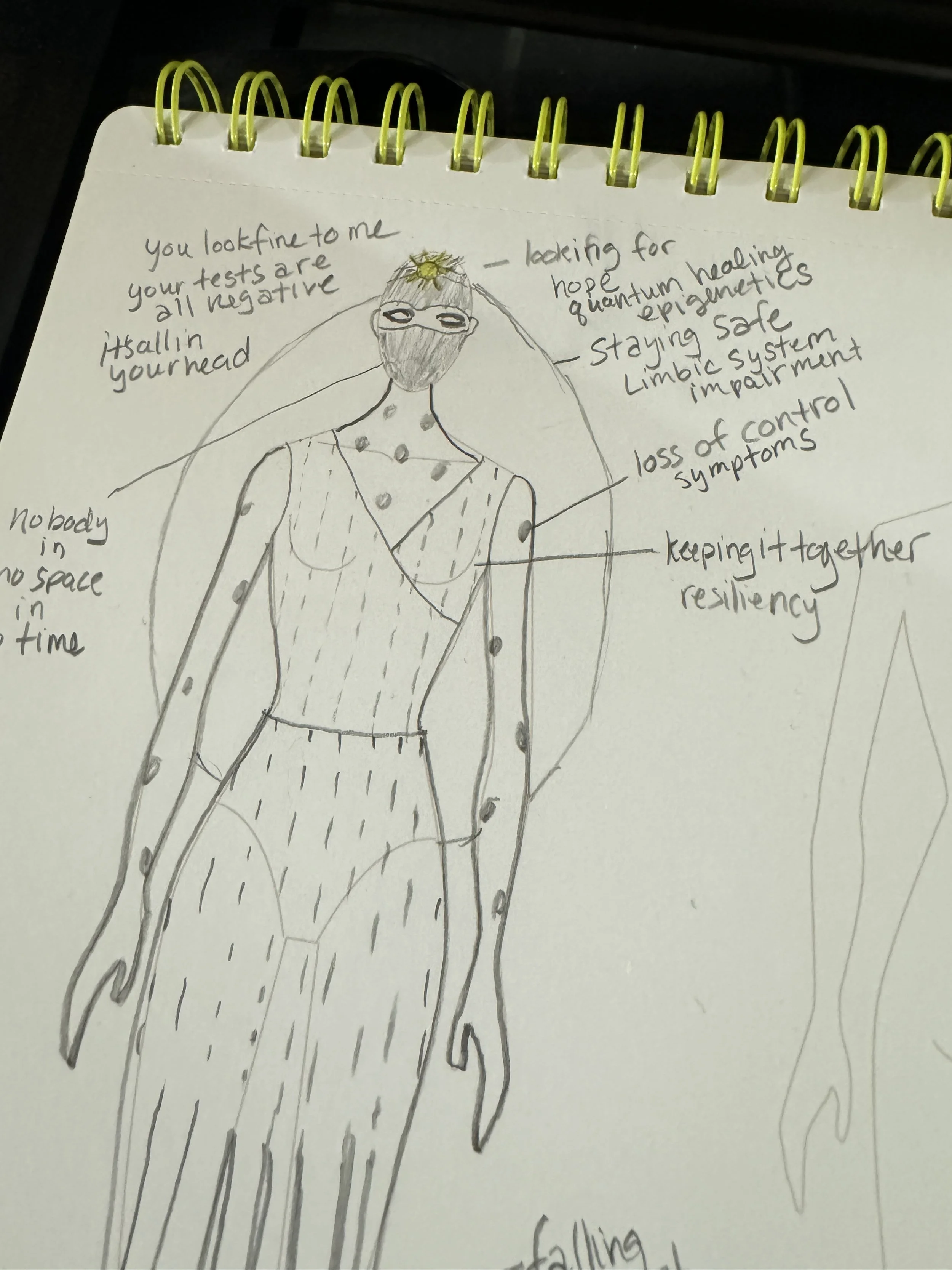 ShadowBall isn't just about fashion; it's a canvas for exploring mental health narratives. My design delves into the intricate emotions of living with a rare chronic illness. From disbelief to stoicism, each stitch tells a story of resilience and metamorphosis.